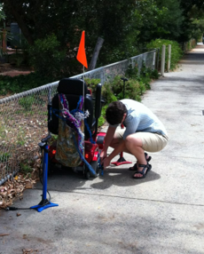 As if to prove that it is a REAL vehicle, my gofer had a flat tyre today! From a large drawing pin that it picked up from somewhere. So Elwyn came home from seeing her friend with her new baby, picked up a bike pump and drove the pump and I to where I’d had to abandon the poor gofer, pumped up the tyre, and I carefully drove the gofer most of the way home before the tyre was flat again. So Elwyn had to come back with the bike pump.