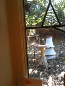 After the butcher bird family spent all of last week in the front yard, especially around the bird bath outside our study window when it was hot, they’ve moved out to our back yard (see the young’un above checking out one of the water bowls in an old tree stump in our back garden) and other gardens around ours. The parents certainly teach their young well!